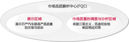 如今日產汽車走遍全球。在各國,無論使用環境、使用方法還是顧客對汽車提出的舒適性均存在較大差異。另外日產汽車的產品陣容有時地區針對性較強,要求要求僅在北美產銷的車型。日產汽車為了向顧客提供更貼心產品,在全球7個地方成立了市場品質解析中心(FQC),更近距離了解各區域需求的同時,可快速應對相關區域中出現的各種問題。市場品質解析中心(FQC)的具體活動為調查分析市場質量(FQIA)※1,目的在于"以顧客驚訝的速度實現快捷改善"。因此,日產汽車構建起讓供應商和日產汽車相關部門※2聯合起來,對改善要素進行深入研究的體制。通過讓與零部件相關的人員面對實物展開討論的方式,力爭在最短時間內找到最佳解決方案。